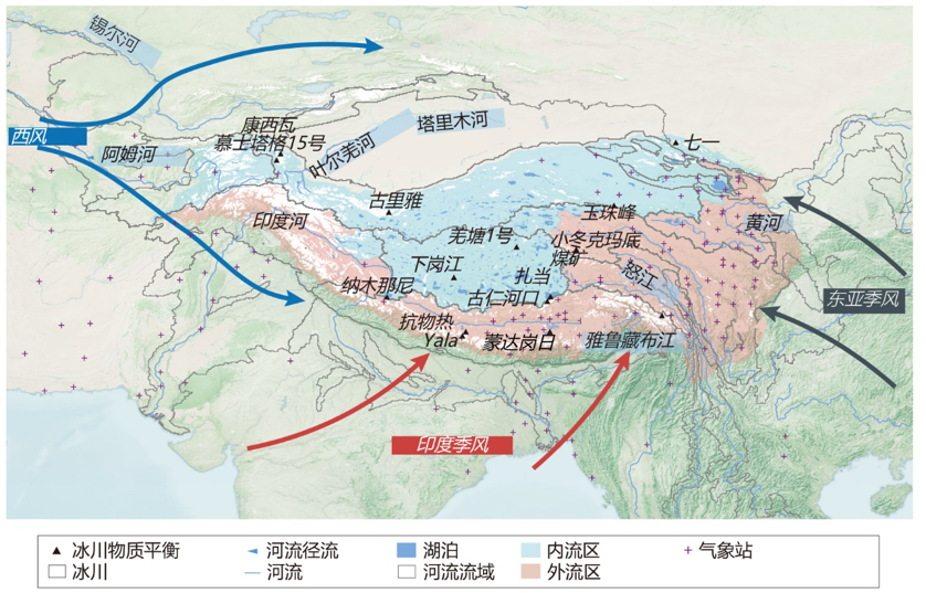 图1 亚洲水塔内流区和外流区 (北部蓝色区域为内流区,南部红色区域为外流区)