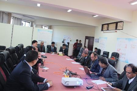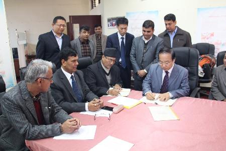 Nidhi Nyaupane签署了关于安装遥感数据模拟系统的协议。梁尔源和特里布文大学水文气象系主任Lochan Prasad Devkota共同主持此次活动。
